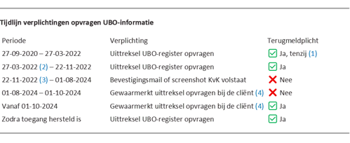 (1) Sinds de invoering van het UBO-register (27 sep 2020) is een Wwft-instelling verplicht een uittreksel uit het UBO-register op te vragen en een terugmelding te doen van onjuistheden. Tijdens de ‘vulperiode’ van het UBO-register (27 sep 2020 – 27 maart 2022) hoeft op een nog niet gedane registratie in het UBO-register geen terugmelding te worden gedaan.